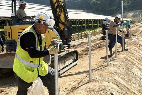 - 太陽光造成工事は、太陽光発電設備の設置に欠かせない基盤づくりを担う工事です。当社では、土地の選定や整地、排水対策、地盤改良など、発電所建設に必要な造成工事を一貫して行っています。周辺環境への配慮や法規制の遵守を徹底し、安全かつ効率的な計画・施工を実現します。これらの取り組みにより、安定した発電効率と長期的な稼働を可能にし、再生可能エネルギーの普及と地域の持続的発展に貢献しています。